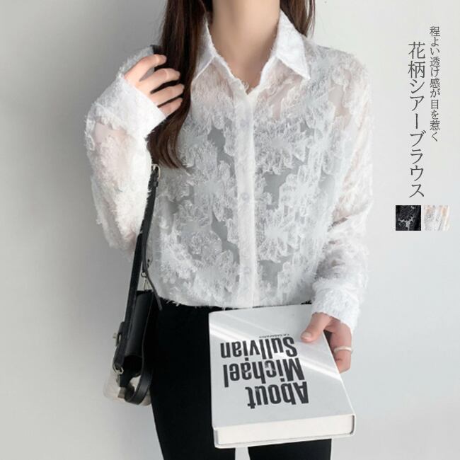 シャツ ブラウス シアーフラワージャガード 長袖 トップス 花柄 シアーシャツ 透け感 ボタン 黒 ホワイト
