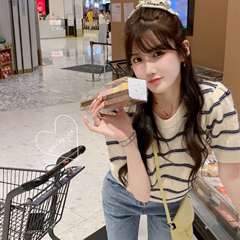 2025新作 レディース ラウンドネック ボーダ柄 着痩せ 可愛い 半袖ニット トップス